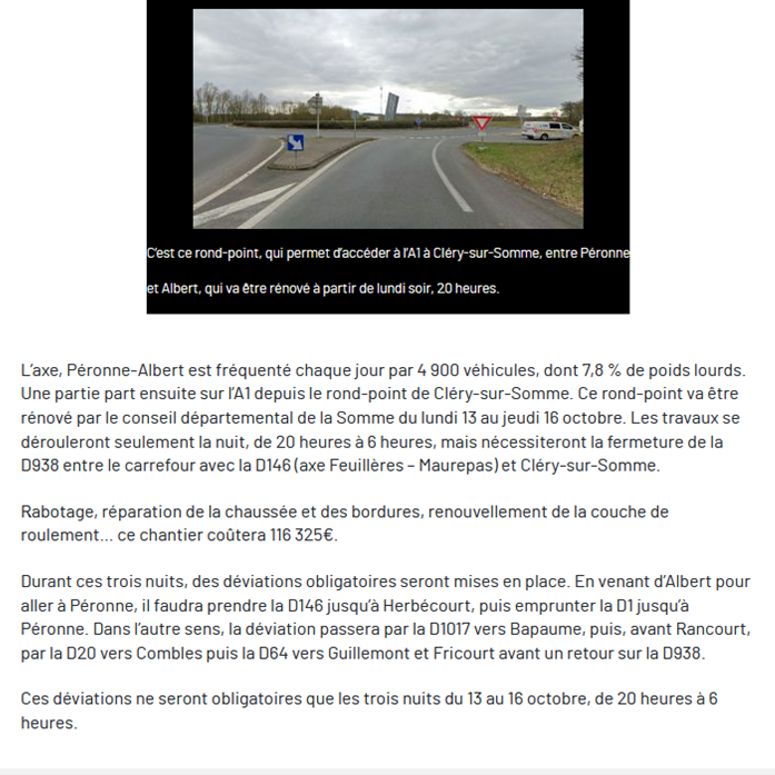 Vous trouverez ci-joint un article du Courrier Picard concernant les travaux du rond point de l’autoroute A1, à l’entrée de Cléry-sur-somme du 13 au 16 octobre 2025.